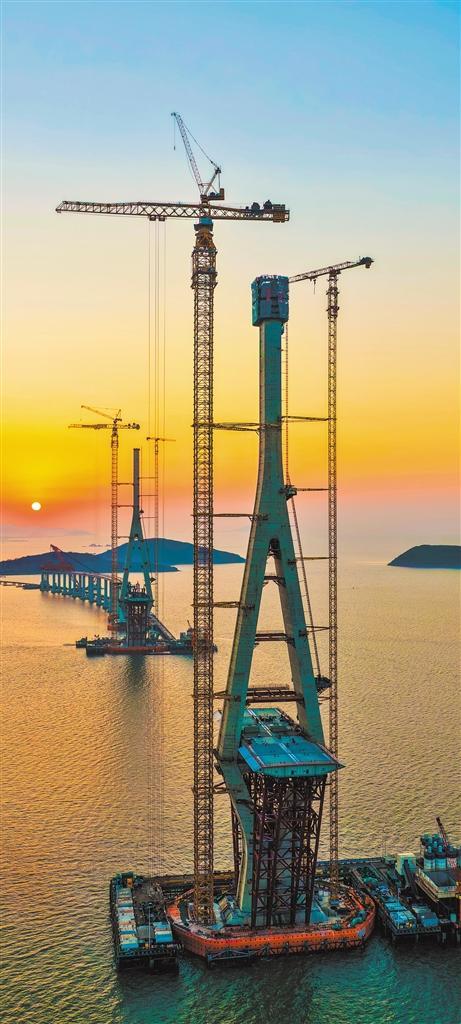 1月13日,位于浙江省宁波市舟山港的青龙门特大桥Q4主塔完成封顶。该桥是宁波舟山港六横公路大桥二期工程控制性工程之一,连接宁波梅山岛与舟山佛渡岛,是世界最大跨度三塔钢箱梁斜拉桥。
