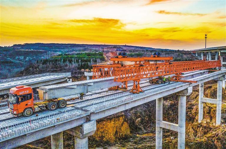 1月11日,位于河南省洛阳市伊滨区诸葛镇的郑州至洛阳高速公路项目建设现场,工人在龙门枢纽进行箱梁架设施工。