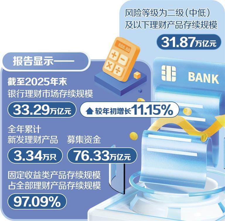 1月23日,银行业理财登记托管中心发布的《中国银行业理财市场年度报告(2025年)》显示,截至2025年末,银行理财市场存续规模33.29万亿元,较年初增长11.15%;全年累计新发理财产品3.34万只,募集资金76.33万亿元。其中,固定收益类产品存续规模为32.32万亿元,占全部理财产品存续规模的97.09%;风险等级为二级(中低)及以下的理财产品存续规模为31.87万亿元,占全部理财产品存续规模的95.73%。