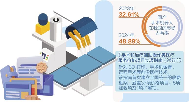 “近两年,国产手术机器人在我国的市场占有率持续提升,从2023年的32.61%增长至2024年的48.89%。”中国科学院院士、解放军总医院泌尿外科医学部教授张旭表示,外科手术机器人是现代科技发展的集大成之作,比肉眼看得更清、比人手操作更灵活稳定,进一步拓展了微创外科的应用可能与技术极限。随着我国医疗科技创新步伐加快,国产手术机器人市场占有率持续提升,在临床应用中正从“补充方案”逐步成为“优先选择”,多款产品更进军欧盟、印度、巴西等海外市场,彰显出强劲的中国科技力量。