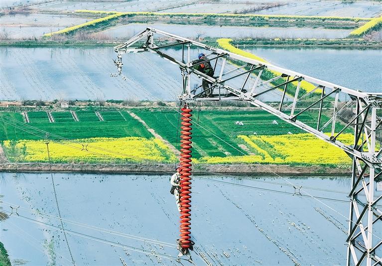近日,在湖北省潜江市浩口镇,电力工人在500千伏江桃线168号铁塔上更换绝缘子。在经历了雨雪冰冻天气后,当地电力部门赶在春季全面排查电力设备,保证夏季用电高峰安全稳定供电。覃 涛摄(中经视觉)