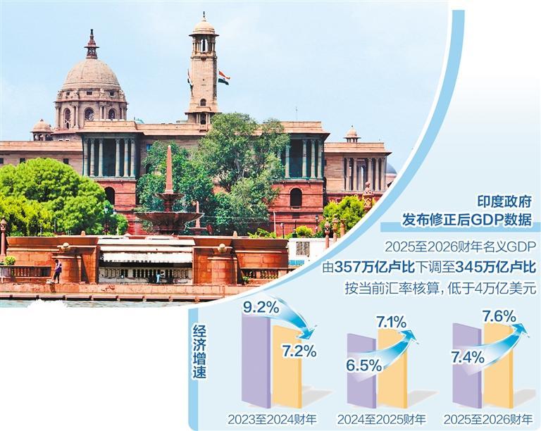 新的统计数据下,印度2025—2026财年的名义GDP从之前的357万亿印度卢比下调至约345万亿卢比,按当前汇率核算,低于4万亿美元,而2025年日本GDP为4.4万亿美元。虽然印度仍是全球增长最快的主要经济体之一,但此前宣称超越日本、成为全球第四大经济体的时间点可能要推迟。同时,印度政府财政赤字和债务压力增大,预计2025—2026财年的赤字率将从之前的4.4%升至4.5%,2026—2027财年的赤字率将从之前的4.3%上升到4.46%,这也意味着未来实现债务稳定的压力更大。