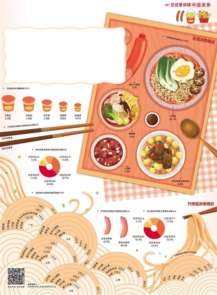 从方便食品消费人群结构看,26岁至45岁人群贡献了近七成成交额,成为方便食品消费市场绝对主力。中青年群体对效率与品质有着双重追求,对“快而美”的餐食接受度极高。