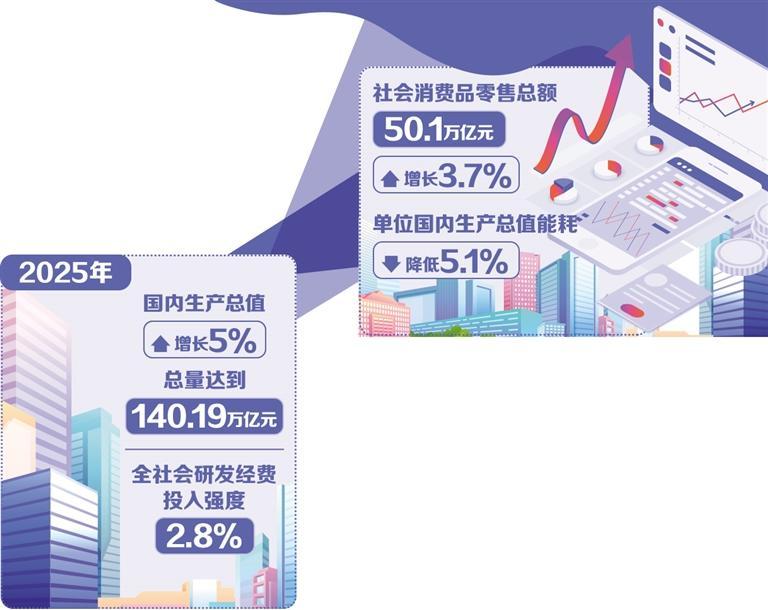其一,推动发展导向转变,以高质量发展为主题。在新的发展导向下,以重大战略、重大政策、重大项目、重大工程等为抓手,不断破解发展难题、厚植发展优势。一方面,更加注重创新驱动。2025年我国全社会研发投入强度提高到2.8%,创新指数排名上升至全球第10位;数字经济、新能源汽车等领域跻身世界领先水平。另一方面,更加强调量质齐升。在实现经济总量稳健增长的同时,现代化产业体系建设成效显著,制造业增加值占全球比重约30%,高技术制造业占比稳步攀升。“十四五”时期,绿色低碳转型步伐加快,生态环境质量持续改善,非化石能源发电装机容量超过化石能源,2025年,单位国内生产总值能耗降低5.1%,发展的底色更绿、成色更足。