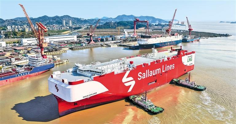 日前,福建省马尾造船股份有限公司建造的LNG(液化天然气)双燃料汽车滚装船启航。近年来,当地坚持以高端化、智能化、绿色化推动海洋工程装备产业高质量发展。谢贵明摄(中经视觉)