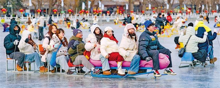 1月10日,游客在北京什刹海冰场游玩。随着天气渐冷,北京各大冰场陆续向公众开放,多样的游玩项目,吸引市民和游客前来感受冬日冰趣。