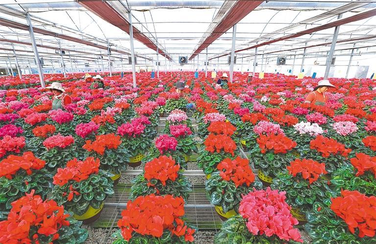 1月25日,花农在山东青岛即墨区灵山花卉文化产业园管护花卉。春节临近,花农们按照订单对花卉进行管护、修剪、整形和包装作业,供应节日市场。梁孝鹏摄(中经视觉)