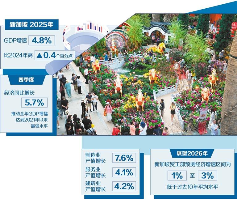 新加坡贸工部近期公布的数据显示:新加坡2025年国内生产总值(GDP)增速达到4.8%,比2024年的4.4%高出0.4个百分点;2025年四季度经济同比增长5.7%,推动全年GDP增幅达到2021年以来最强水平。这一经济表现远高于贸工部2025年11月时预测的“4.0%左右”,以及之前预估的1.5%至2.5%区间,凸显出新加坡经济在复杂环境中的强劲韧性。新加坡这一经济成就是在全球贸易壁垒高企、美国加征关税举措等多重压力下实现的,其实际含金量远不止数字本身。