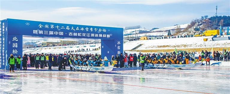 1月31日,全国第十二届大众冰雪季分会场暨第三届中国·吉林松花江滑冰挑战赛在白山市靖宇县花园口镇开赛。赛事设置了滑冰挑战赛、冰上龙舟邀请赛、雪地健康跑3项冰雪项目,吸引了吉林省内外3000多名选手参赛。李纯金摄(中经视觉)