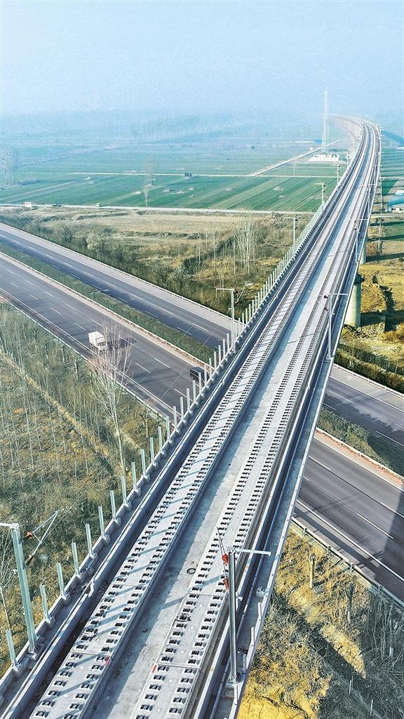2月1日,在河北省保定市顺平县的雄忻高铁建设现场,施工人员将首对500米长钢轨铺设在无砟道床上,标志着雄忻高铁正式进入铺轨施工阶段。据悉,雄忻高铁是我国“八纵八横”高速铁路网京昆通道的重要组成部分,线路东起雄安站,终至忻州西站,正线全长约342公里。新华社记者 朱旭东摄