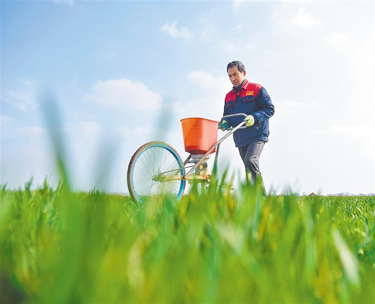 3月6日,山东省聊城市茌平区贾寨镇堤头袁村,农民进行小麦施肥作业。