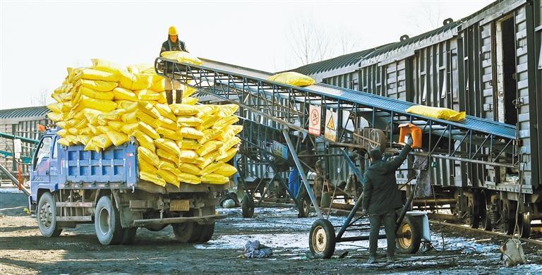 3月9日,中国铁路哈尔滨局集团有限公司大庆车务段肇东站货场,工作人员在装卸化肥。原 勇摄(中经视觉)